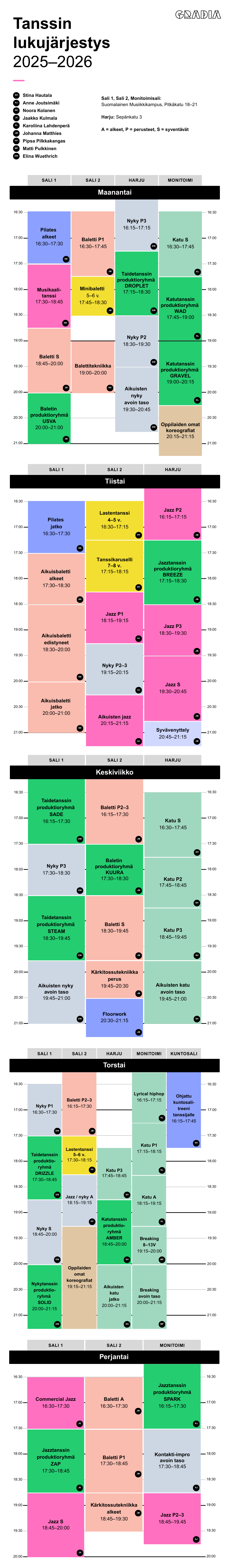 | SALI 2 | 16.15–17.30 Baletti P2–3 Johanna Matthies | 17.30–18.30 Baletin produktioryhmä Kuura Johanna Matthies | 18.30–19.45 Baletti S Johanna Matthies | 19.45–20.30 Kärkitossutekniikka, Perus Johanna Matthies | 20.30–21.15 Floorwork Johanna Matthies |